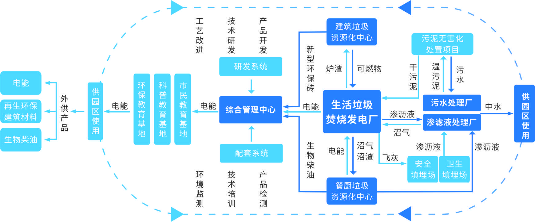 今年会jinnianhui环境循环经济产业园模式以生活垃圾焚烧发电厂为园区核心,统筹各类生活垃圾处置中心的配套建设,对各类生活废弃物进行无害化、减量化、资源化处理,输出电能、建筑材料、生物柴油等副产物,为园区生产、生活提供服务。