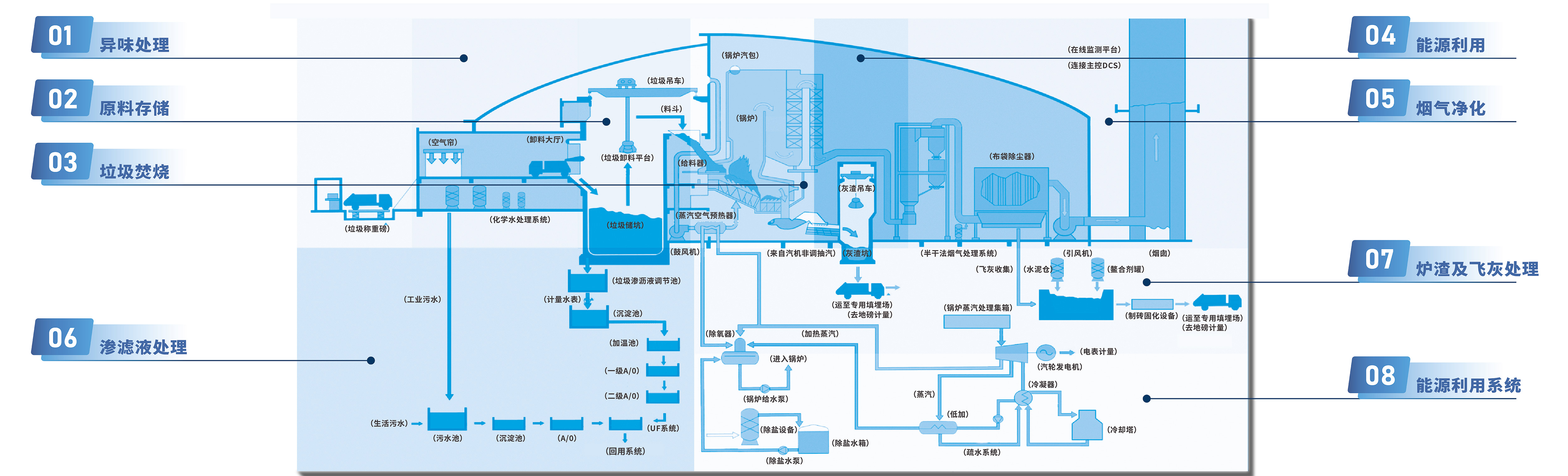 今年会jinnianhui环境生活垃圾焚烧发电处理模式将全流程划分为八大模块,构建囊括垃圾入库、储存、焚烧,烟气净化、渗滤液处理、炉渣及飞灰处理、热能产生、能源利用的八大系统。